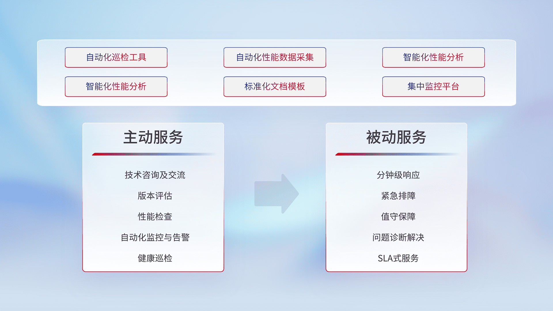 智能化工具和标准化文档,,,保障服务质量,,,,提供主动服务(包含技术咨询、、、版本评估、、、性能检查、、、、自动化监控与告警、、健康巡检)和被动服务包含(分钟级响应、、、紧急排障、、、值守保障、、、问题诊断解决、、、、SLA服务)。。。。